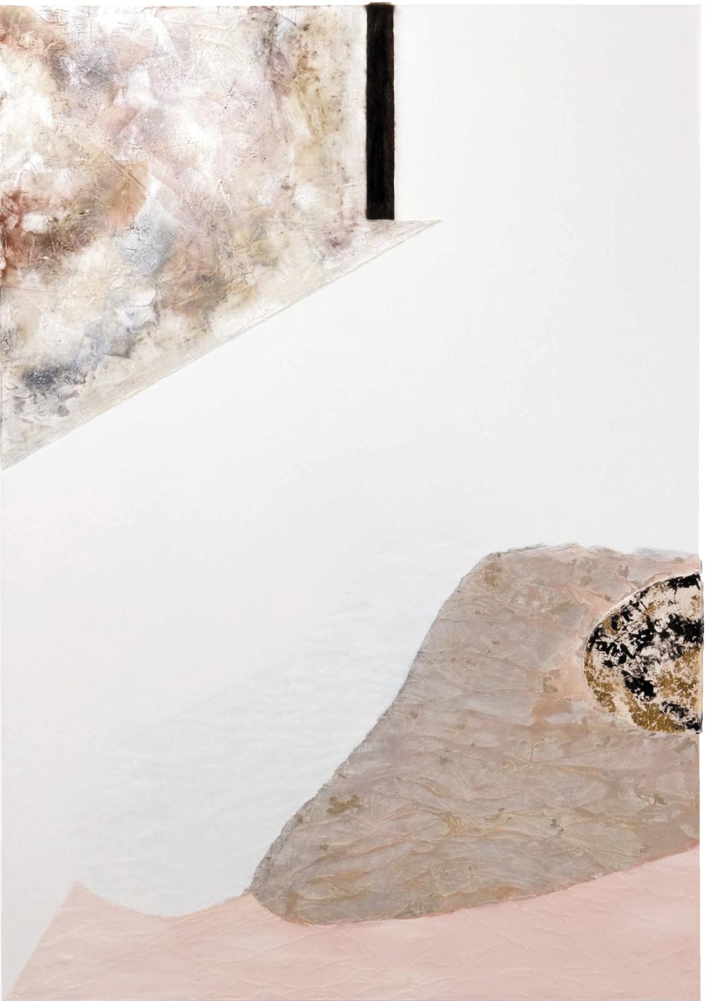 The body is part of the landscape, not only in a metaphorical sense, but in terms of chemistry. The fact that we all come from dust and will turn to dust one day has a lot to do with my work: the parts that are supposed to fall off will actually fall off; then, the other parts that aren’t supposed to be destroyed immediately will also be destroyed. In the end, there will be nothing left but hair, bone-like surfaces and synthetic emulsions. In the physical sense, they will take for about as long to decay as our skeletons when they finally become part of the landscape. And the hair will take just as long to decay as our own hair. You said that I only started painting landscapes again after 15 years of not having looked at the landscapes that came back to me from Finland, from the “land of shadows”, but it only seems that way. In fact, these pieces are “tattooed” landscapes of the body, whose idea already appears in my earlier pink and white series, which also contain hair. In this idea, the body is very physical: it is covered with wounds and signs. This is something I have been concerned with for the last five years. The body is more important than the landscape. But now, I find myself attracted to color again, even if it never really disappeared from my work. For an example, my white was never really white: it actually consisted of twenty some-odd layers, all of which shine through: each of their tones is different and never repeats. For a while, I was working with light, almost white surfaces; it seemed to me that any use of bright color would separate the piece from the space that surrounds it, stopping it from dissolving. But I would like the piece to dissolve, only allowing certain elements of space to emerge, and then all the rest.