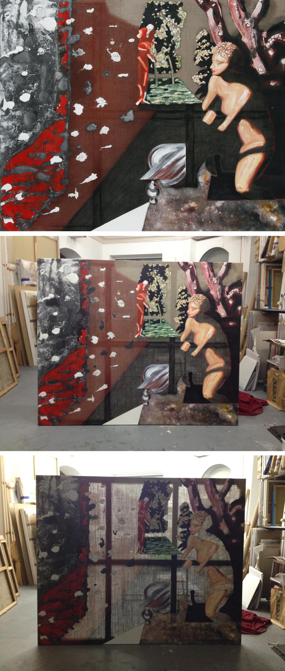 His initial intuition was to treat shadow (to be painted ‘transparently’, in the academic tradition) using translucent drawing materials such as charcoal and sanguine, and to treat light with opaque paint formations. The resulting constellations of drawing and painting reminded him of the ‘cartoons’ (it. cartone) created by contemporaries of Tintoretto, using charcoal and paint as part of a single technical process. The cartoons served as templates, for example: by perforating the drawn outlines and then dusting them with charcoal, one could transfer designs for frescos, essentially ‘projecting’ the depicted shapes onto the supporting surface.